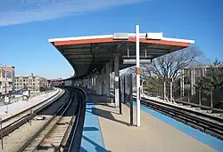 La plate-forme centrale est élevée sur un talus au milieu des voies centrales ou roulent les rames de la ligne rouge. Il n'y a pas de plate-forme d'accès aux voies express à l'extérieur desservies par la ligne mauve.