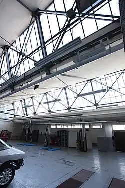 - la surface de l’atelier est agrandie et on lui ajoute l’équivalent de deux sheds. La différence entre les sheds première phase et deuxième phase est visible même dans leur structure : les plus anciens se composent d’une verrière de carreaux maintenus par une structure métallique d’orientation verticale, la deuxième est renforcée par une structure métallique en forme de croix. C’est dans cette extension que sont placés les ateliers mécanique automobile et le magasin du lycée. L’espace central de l’atelier reste ouvert, sans cloisons jusqu’aux années 2000. Sur la façade ouest des ateliers, deux autres salles sont adjointes. Très vastes afin d’accueillir les machines nécessaires aux élèves, elles sont éclairées par des lanterneaux carrés (photo)