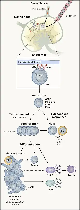 Dans les réponses immunitaires T-dépendantes, de rares lymphocytes B engagés dans un antigène doivent rencontrer de rares lymphocytes T spécifiques d’un antigène apparenté. L’une des premières conséquences du déclenchement du signal par les récepteurs des lymphocytes B est la régulation positive du récepteur de la chimiokine CCR7 et EBI2, ces récepteurs chimioattractants agissant ensemble pour guider vers la frontière entre la zone folliculaire des lymphocytes B vers et la zone des lymphocytes T[33]. Un autre effet est la régulation négative de la sphingosine-1-phosphate receptor 1 pour garantir que les cellules B activées sont retenues dans le tissu répondeur. À l’interface follicule-zone T, les lymphocytes B interagissent avec les lymphocytes T auxiliaires CD4, ces derniers souvent (mais pas toujours) pré-activés par la rencontre avec les cellules dendritiques présentatrices d’antigènes, et s’engagent dans des interactions qui durent des dizaines de minutes. et parfois plus d'une heure[34],[35],[36].