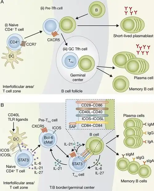 - ↑ Dagmar Breitfeld, Lars Ohl, Elisabeth Kremmer et Joachim Ellwart, « Follicular B Helper T Cells Express Cxc Chemokine Receptor 5, Localize to B Cell Follicles, and Support Immunoglobulin Production », The Journal of Experimental Medicine, vol. 192, no 11, , p. 1545–1552 (ISSN 0022-1007 et 1540-9538, PMID 11104797, PMCID PMC2193094, DOI 10.1084/jem.192.11.1545, lire en ligne, consulté le )