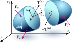 Dans le cas général, un élément de matière situé au cœur d'une pièce est soumis à des contraintes dans diverses directions. Dans le cadre de la théorie du premier gradient, on représente cet état de contrainte par un tenseur d'ordre deux (que l'on peut lui-même représenter par une matrice 3×3) appelé tenseur des contraintes.