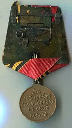 Des médailles en bronze cuivre ont été décernées aux militaires qui n'ont pas participé directement aux batailles, mais qui étaient en service dans des armées actives et qui l'étaient jusqu'au jour de la ratification du traité de paix en Extrême-Orient, ainsi que le long du Transsibérien et du chemin de fer Samara-Zlatoust, dans les zones situées sous la loi martiale. De même avec d'autres variantes de la décoration, les militaires, les marins, les gardes-frontières, les milices, les prêtres, les médecins ont pu recevoir la médaille s'ils étaient en service avec les troupes ou les institutions médicales.