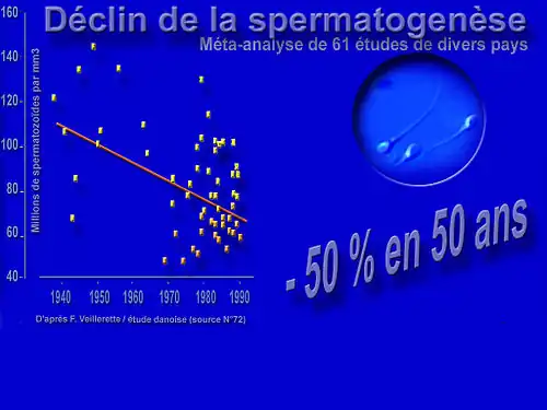 Depuis le milieu du XXe siècle, un déclin global et régulier de la quantité et /ou la qualité du sperme humain est constaté par de nombreuses études faites dans les pays riches[20],[21],[22],[23],[24],[25],[26],[27] alors que d'autres études (également faites chez les hommes de couples infertiles ou fertiles, dans d'autres régions ou les mêmes) ne détectent pas de déclin[28],[29],[30],[31],[32],[33],[34],[35].