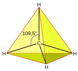 La molécule de méthane CH4 illustre ce cas : les sommets sont occupés par des atomes d'hydrogène ; l'atome de carbone se situe au point de rencontre des médianes.