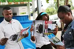 Des Congolais lisant le magazine Échos de la Monusco en 2014