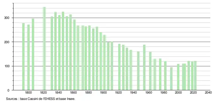 L'évolution du nombre d'habitants est connue à travers les recensements de la population effectués dans la commune depuis 1793. Pour les communes de moins de 10 000 habitants, une enquête de recensement portant sur toute la population est réalisée tous les cinq ans, les populations de référence des années intermédiaires étant quant à elles estimées par interpolation ou extrapolation[22]. Pour la commune, le premier recensement exhaustif entrant dans le cadre du nouveau dispositif a été réalisé en 2008[23].