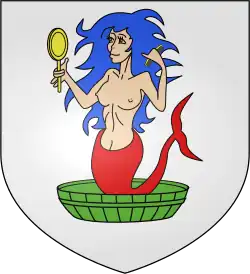 Ci-contre : d'argent, à la mélusine de carnation, chevelée d'azur, marinée de gueules au miroir d'or et au peigne du même, dans son baquet de sinople.
