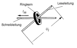 La lecture est effectuée en envoyant de nouveau un courant de lecture Im dans l'un des fils, qui permet de détecter la magnétisation actuelle du tore. Selon l'état du tore, ce courant va inverser le champ magnétique dans le tore ou pas. Ce changement du champ magnétique induit une tension UI dans le second fil qui peut être mesurée. Cette lecture du contenu du tore est destructrice. Elle remet le contenu à zéro, ce qui nécessite de réécrire le contenu antérieur du tore pour rétablir sa valeur.
