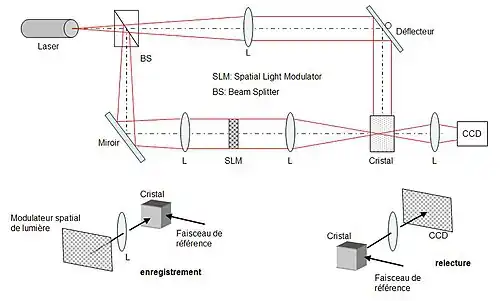 Pour l'enregistrement, le faisceau est agrandi par les lentilles (L), afin d'illuminer complètement un modulateur spatial de lumière (SLM) (en réalité un panneau LCD, ressemblant à une sorte de grille, où les cases « opaques » et « transparentes » représentent respectivement les « 0 » et les « 1 » de l'information à stocker).