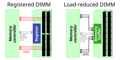 Les modules DIMM à registres (tamponnés) (R-DIMM) insèrent une mémoire tampon entre les broches des bus de commande et d’adresse sur le DIMM et les puces mémoire. Un module DIMM haute capacité peut être doté de nombreuses puces mémoire, chacune d’entre elles devant recevoir l’adresse mémoire, et leur capacité d’entrée combinée limite la vitesse à laquelle le bus de mémoire peut fonctionner. En redistribuant les signaux de commande et d’adresse au sein du R-DIMM, cela permet à davantage de puces d’être connectées au bus mémoire[4]. Le coût est une latence mémoire (en) accrue, à la suite du cycle d’horloge supplémentaire requis pour que l’adresse traverse la mémoire tampon supplémentaire. Les premiers modules de RAM enregistrés étaient physiquement incompatibles avec les modules de RAM non enregistrés, mais les deux variantes de SDRAM R-DIMM sont mécaniquement interchangeables, et certaines cartes mères peuvent prendre en charge les deux types[5].