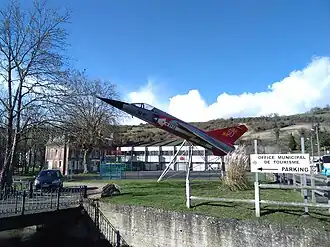 Sur l'esplanade dans la rue Raymond Phelip, un Mirage F1 peint aux couleurs du 50e anniversaire du Normandie-Niémen est exposé.