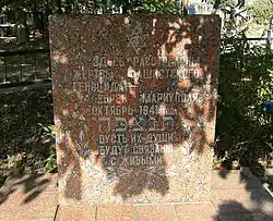 - "Victimes du génocide fasciste – les Juifs de Marioupol ont été fusillés ici. octobre 1941" („Здесь расстреляны жертвы фашистского геноцида - евреи Мариуполя. Октябрь 1941 года. Пусть их души будут связаны с живыми“)