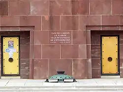 Inscription sur la façade de la crypte provisoire : « Nous sommes ici pour témoigner devant l'Histoire que de 1939 à 1945 ses fils ont lutté pour que la France vive libre »[6].