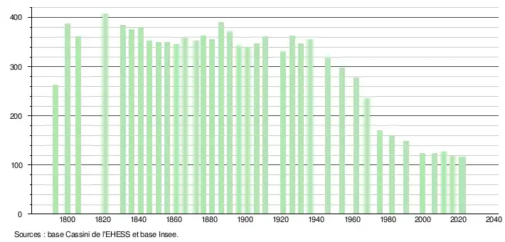 L'évolution du nombre d'habitants est connue à travers les recensements de la population effectués dans la commune depuis 1793. Pour les communes de moins de 10 000 habitants, une enquête de recensement portant sur toute la population est réalisée tous les cinq ans, les populations de référence des années intermédiaires étant quant à elles estimées par interpolation ou extrapolation[31]. Pour la commune, le premier recensement exhaustif entrant dans le cadre du nouveau dispositif a été réalisé en 2006[32].