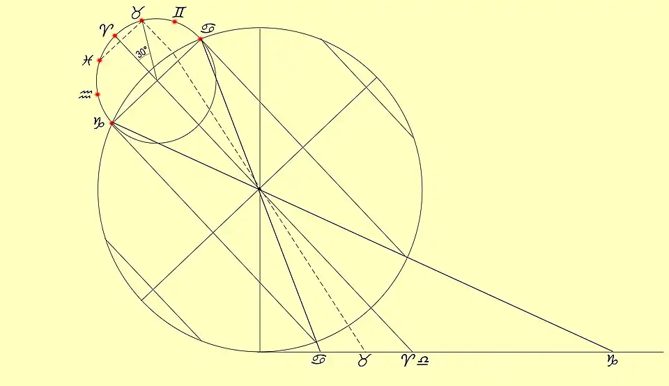 - ↑ L'instant des solstices, de moindre intérêt, n'est pratiquement pas possible à déterminer graphiquement, la variation de la déclinaison solaire vers ces dates étant imperceptible.