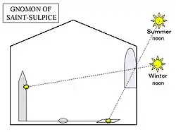 - ↑ Le gnomon est en fait constitué de deux œilletons, l'un, à 25,98 m du sol, d'un pouce de diamètre qui était utilisé vers le solstice d'hiver et les équinoxes, l'autre, installé à 24,36 m de hauteur, comportait une lentille convergente de 80 pieds de foyer qui permettait d'étudier la tache de lumière pratiquement sans pénombre au solstice d'été. Voir Denis Savoie, "Pierre-Charles Le Monnier et la méridienne de Saint Sulpice", Cadran Info, n° 38, octobre 2018, p. 92-110 .