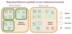 Elle est composée de plusieurs localités (ou patchs) connectées par la dispersion et pouvant être séparées par une matrice inhabitable (méta-communauté sensu stricto) ou par un habitat continu (méta-communauté sensu lato). Ces localités peuvent être hétérogènes suivant des variables biotiques et abiotiques.