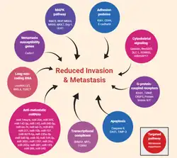 Les suppresseurs de métastases inhibent la croissance et la prolifération du cancer au niveau du site métastatique sans affecter la tumeur primaire [153],[154]. Ils ciblent les voies oncogènes et les protéines impliquées dans l'invasion et l'éventuelle colonisation métastatique. Par exemple, la A-kinase-anchoring protein 8 est un facteur régulateur d'épissage qui supprime le microenvirronement tumoral et les métastases du cancer du sein [155]. Dans les cellules hautement métastatiques, les suppresseurs de métastases sont généralement régulés négativement par rapport aux cellules tumorales primaires [156],[157],[153]. Au cours de la dernière décennie, un nombre important de suppresseurs de métastases ont été identifiés. Plus particulièrement, les micro-ARNs qui suppriment les oncogènes et inhibent la signalisation tumorigène ont été reconnus et explorés comme biomarqueurs potentiels et cibles des métastases.