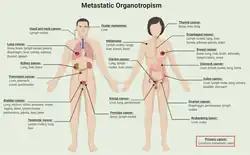 Le cancer de la prostate, par exemple, métastase généralement dans les os. De la même façon, le cancer du côlon tend à métastaser dans le foie. Chez les femmes, le cancer de l'estomac métastase souvent dans les ovaires, où il forme une tumeur de Krukenberg. On avait remarqué que le plus souvent les principaux organes-cibles des métastases sont ceux qui jouent un rôle de filtre dans le corps sain (ex. : foie) ou dans le système immunitaire (ex. : glandes surrénales).