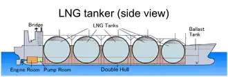 Les méthaniers à sphère se composent de quatre à cinq cuves sphériques en aluminium recouvertes d'une isolation. Les sphères ne sont pas intégrées à la coque et dépassent du pont du navire.