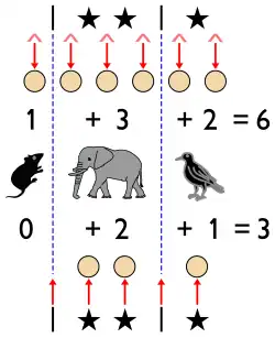 La configuration sera déterminée dès que l'on connaitra la première étoile allant dans le deuxième bac, la première étoile allant dans le troisième bac, etc. Cela est indiqué en plaçant k − 1 barres entre les étoiles. Puisqu'aucun bac n'est autorisé à être vide (toutes les variables sont strictement positives), il y a au plus une barre entre chaque paire d'étoiles. Par exemple :