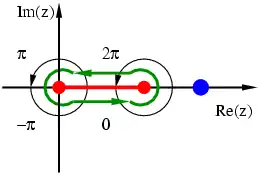 On peut voir que les intégrales sur Γ et γ tendent toutes deux vers 0 pour ε → 0 et R → ∞, par une estimation donnée au-dessus, ce qui laisse deux termes. Comme z1/2 = e(Log z)/2, sur le contour hors du branchement, on a gagné 2π en argument le long de γ. (Par l'identité d'Euler, eiπ représente le vecteur unité, donc a un log égal à π, ce qui correspond à l'argument de z. Le coefficient de 12 force à utiliser 2π.) Ainsi