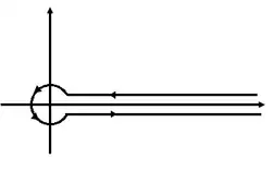 On utilise alors le contour du "trou de serrure", formé d'un petit cercle ouvert de rayon ε, s'étendant sur un segment parallèle au demi-axe jusqu'à un autre cercle ouvert.