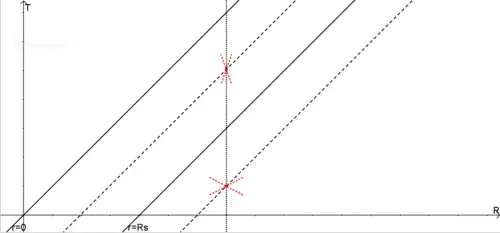 Les droites inclinées vérifient R-c.T = constante (ce qui implique que r = constante). La 1re en trait plein correspond à r = 0, la 2de en trait plein correspond à r = Rs. Un corps en chute libre suit la droite verticale (avec le temps T croissant, donc vers le haut du graphique) et la base de son cône de lumière est en rouge.
