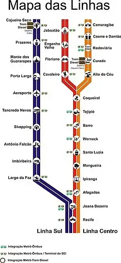 Le réseau compte deux lignes dont une, la ligne Centro, possède deux branches. La ligne a un écartement large et est exploitée par Metrorec (Metro Recife) intégré.dans une organisation intégrée des transports de l'agglomération[9].