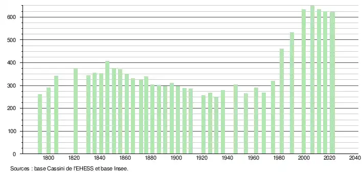 L'évolution du nombre d'habitants est connue à travers les recensements de la population effectués dans la commune depuis 1793. Pour les communes de moins de 10 000 habitants, une enquête de recensement portant sur toute la population est réalisée tous les cinq ans, les populations de référence des années intermédiaires étant quant à elles estimées par interpolation ou extrapolation[23]. Pour la commune, le premier recensement exhaustif entrant dans le cadre du nouveau dispositif a été réalisé en 2006[24].