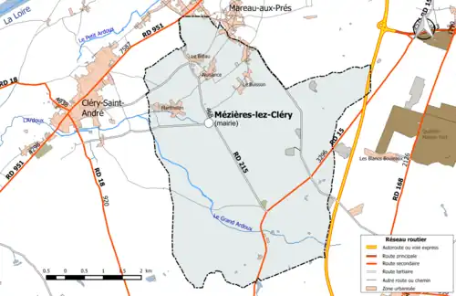 La commune est traversée par deux routes départementales : la RD 15 (3 296 véhicules/jour), qui relie Olivet à Ligny-le-Ribault[38] et la RD 215 (468 véhicules/jour), qui est en totalité sur le territoire communal et relie la RD 15 au sud et la RD 951 au nord[38].