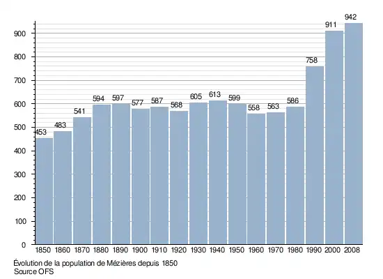 Selon l'Office fédéral de la statistique, Mézières possède 1 147 habitants en 2023[1]. Sa densité de population atteint 128 hab./km2.
