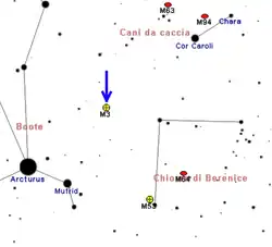 M3 (ou NGC 5272) est un amas globulaire situé dans la constellation des Chiens de chasse à environ 33 300 a.l. de la Terre[3]. Il a été découvert par l'astronome français Charles Messier en 1764[5]. La magnitude apparente de cet amas est de 6,3, celui-ci est donc situé juste au-dessus de la limite théorique de visibilité à l'œil nu.