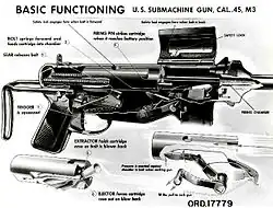 Le bloc culasse comprend dans sa partie avant l’extracteur et un percuteur fixe. Un levier situé sur le côté droit de la carcasse permet d’armer le mécanisme[28]. Par rapport au reste de l’arme, ce système est assez compliqué et s’est révélé assez peu fiable, le levier ayant tendance à casser à la base[5]. Il est par conséquent remplacé sur le M3A1 par une simple encoche sur le bloc de culasse, qui permet à l’utilisateur de la tirer en arrière avec le doigt[29].