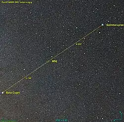 M56 est presque sur une ligne droite entre deux étoiles brillantes, à environ 3,7 degrés au nord-ouest de Beta Cygni et à environ 4,5 degrés au sud-est de Gamma Lyrae.