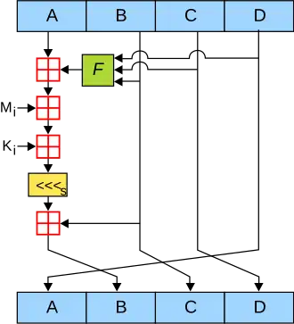 Une opération de MD5. MD5 comprend 64 blocs de ce type, groupés en quatre tours de 16 opérations. F est une fonction non linéaire, qui varie selon le tour. Mi symbolise un bloc de 32 bits provenant du message à hacher et Ki est une constante de 32 bits, différentes pour chaque opération.