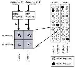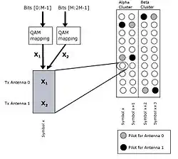 On considère un système MIMO composé de antennes à l'émission et de antennes à la réception. On note le vecteur de taille contenant les symboles envoyés et le vecteur contenant les symboles reçus[2]. La relation qui relie et s'écrit alors :