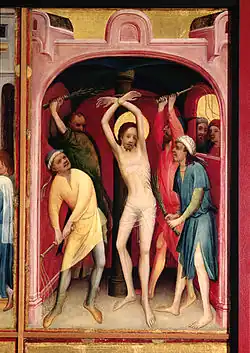 - Deux volets subsistent, de grandes dimensions (184 × 175 cm). Chaque volet contient en deux rangées six peintures relatant les épisodes de la Passion, dont chacun fait environ 90 × 57 cm. Le premier panneau contient, de la gauche vers la droite et du haut vers le bas : le Christ au mont des oliviers, le Christ devant Pilate, la Flagellation, le Couronnement d'épines, et le Portement de croix. Du deuxième, il manque l'une des six peintures. Les tableaux restants ont pour thèmes : la Crucifixion, la Descente de la croix, le Christ aux nimbes, la Résurrection, le Noli me tangere et enfin l'Ascension. La Mise au tombeau a été détruite pendant la Seconde Guerre mondiale[4].