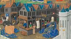 - Brunetto Latini, Trésor[23]. Deux grandes miniatures subsistent des quatre frontispices. L'une d'elles comporte une fameuse représentation d’un marché urbain médiéval[24].