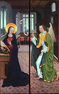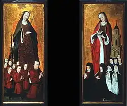 - Deux panneaux d’un retable, Wallraf-Richartz Museum, WRM 0126 et 0127. Sainte Catherine est représentée avec le donateur et huit fils, saint Barbe avec la donatrice et sept filles. L'extérieur des retables présente l'ange de l'Annonciation et Marie. L'identité des donateurs est inconnue, l'attribution au Maître de la Légende de saint Georges est discutée[9]