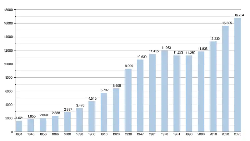 Les chiffres des années 1831 à 1970 tiennent compte des chiffres des anciennes communes fusionnées.