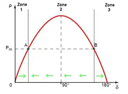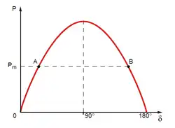 Ce générateur reçoit une puissance mécanique, typiquement d'une turbine, notée Pm. À l'équilibre, la puissance entrante, mécanique, est égale à la puissance sortante, électrique. On néglige ici les pertes[14]. Pour cet équilibre deux angles internes sont possibles (cf. image).
