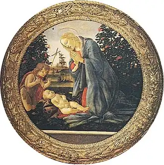 Le célèbre tondo de Sandro Botticelli représente la Vierge agenouillée en prière devant l'Enfant, qui est allongé sur un coussin de roses coupées par les deux buissons qui apparaissent à gauche et à droite du tableau. La troisième figure est San Giovannino, également en prière et adorant. Dans la partie inférieure du tableau se trouve un faux cadre rectiligne en bois, sous lequel on peut lire la phrase « QUIA RESPESIT HUMILITATE ANCILE SUE », extraite du Canto del Magnificat, dérivée de l'Évangile selon Luc (1, 46-55), dont la signification est la suivante : « Parce-que Dieu a observé l'humilité de sa servante ». Le fond rappelle les paysages de Léonard de Vinci. Le cadre précieux a été gravé et doré par le sculpteur Benedetto da Maiano[2].