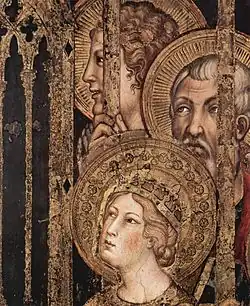 Enfin, il convient de noter comment le passage des auréoles rayonnées à celles ornées de motifs floraux se retrouve également dans les figures principales : alors que tous les saints, anges et archanges debout à droite ont des auréoles rayonnantes (à l'exception de sainte Catherine qui, selon la chronologie de bandes de droite à gauche, était la dernière à être réalisée dans cette zone de la fresque et d'ailleurs refaite en 1321), la Vierge, l'Enfant et toutes les figures de gauche ont des auréoles réalisées au pochoir. Ceux-ci demeurent également dans les auréoles de tous les saints et anges agenouillés en dessous. Contrairement aux disques, dans les figures de la fresque, il y a aussi des moules circulaires avec une étoile à huit branches, chacun se terminant par une petite feuille ovoïde.