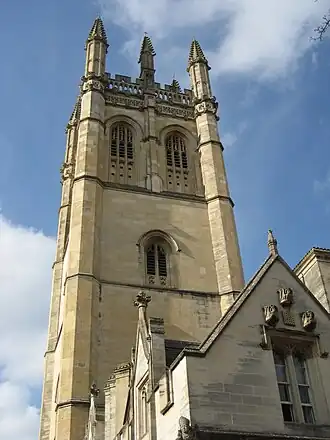 Lorsqu'on arrive à Oxford par l'est, on ne peut manquer d'apercevoir la grande tour carrée de Magdalen College, élevée entre 1492 et 1509. Le bâtiment principal et la chapelle datent de la même époque, tout en ayant subi de multiples transformations depuis lors.