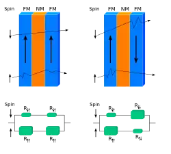 Dans certains matériaux, l’interaction entre les électrons et les atomes est plus faible quand leurs moments magnétiques sont antiparallèles plutôt que parallèles. Une combinaison de ces deux types de matériaux peut résulter en un effet appelé magnétorésistance géante inverse[8],[16].