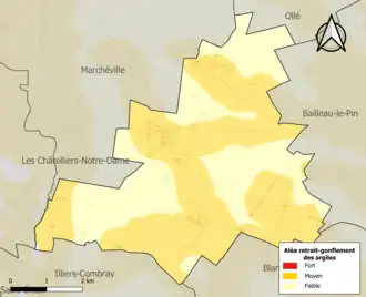 Le retrait-gonflement des sols argileux est susceptible d'engendrer des dommages importants aux bâtiments en cas d’alternance de périodes de sécheresse et de pluie. 59 % de la superficie communale est en aléa moyen ou fort (52,8 % au niveau départemental et 48,5 % au niveau national). Sur les 281 bâtiments dénombrés sur la commune en 2019, 205 sont en aléa moyen ou fort, soit 73 %, à comparer aux 70 % au niveau départemental et 54 % au niveau national. Une cartographie de l'exposition du territoire national au retrait gonflement des sols argileux est disponible sur le site du BRGM[17],[Carte 2].