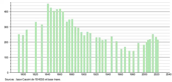 | L'évolution du nombre d'habitants est connue à travers les recensements de la population effectués dans la commune depuis 1793. Pour les communes de moins de 10 000 habitants, une enquête de recensement portant sur toute la population est réalisée tous les cinq ans, les populations de référence des années intermédiaires étant quant à elles estimées par interpolation ou extrapolation[26]. Pour la commune, le premier recensement exhaustif entrant dans le cadre du nouveau dispositif a été réalisé en 2004[27]. En 2022, la commune comptait 215 habitants[Note 3], en évolution de −21,25 % par rapport à 2016 (Gers : +1,04 %, France hors Mayotte : +2,11 %). |
