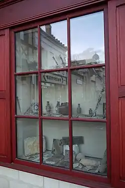 Dans la vitrine de la boutique sont exposés différents objets anciens trouvés lors de la restauration de la maison.