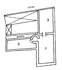 La tourelle en pierre à poivrière, qui renferme un escalier en hélice, y est accolée. Les deux ailes (notée 2 et 3 sur le plan) sont du début du XVIe siècle et enveloppent la tourelle dont seul le sommet émerge aujourd'hui de la toiture. L'aile sur la rue (notée 2) est divisée à l'étage en trois petites salles desservies par un galerie donnant sur une petite cour arrière, celle-ci étant limitée par le mur du cloître du couvent des bénédictines (aujourd'hui une maison de retraite) qui jouxte la maison.